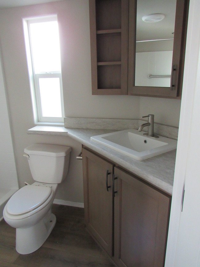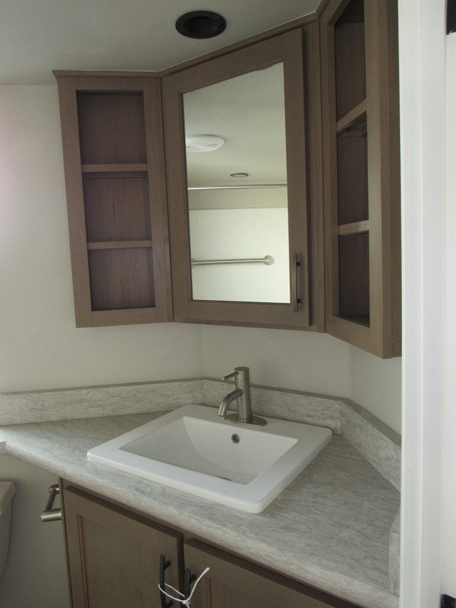 • Vanity & Counter: 36” tall lavy cabinet with square drop-in sink, laminate countertops, and optional ceramic tile backsplash.