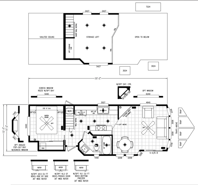 • Cooking Appliances: 30” propane gas range (natural gas optional) and 16 cu. ft. double-door frost-free refrigerator.
