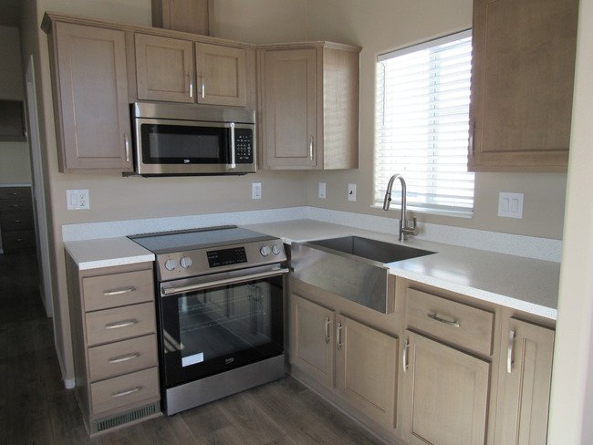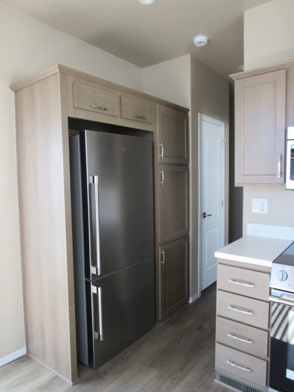 The thoughtfully designed L-shaped kitchen combines functionality and style. Equipped with a full-size refrigerator, gas range, and microwave, it maximizes counter space and provides ample storage for all your culinary essentials, making cooking and entertaining effortless.