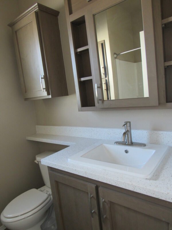 Featuring a sleek sink, toilet, and shower with sliding glass door, the bathroom balances style with practicality for a refreshing daily routine.